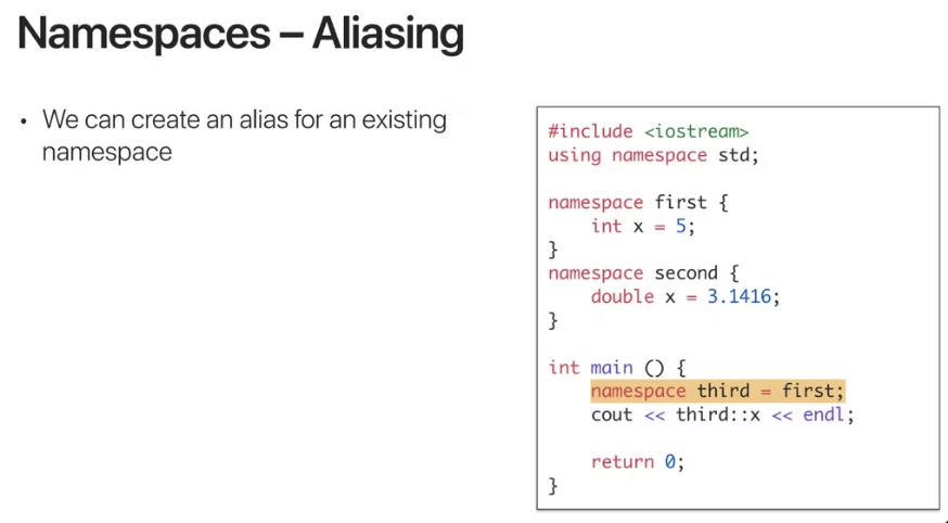 위 예시와 같이 namespace third = first;를 입력해주면