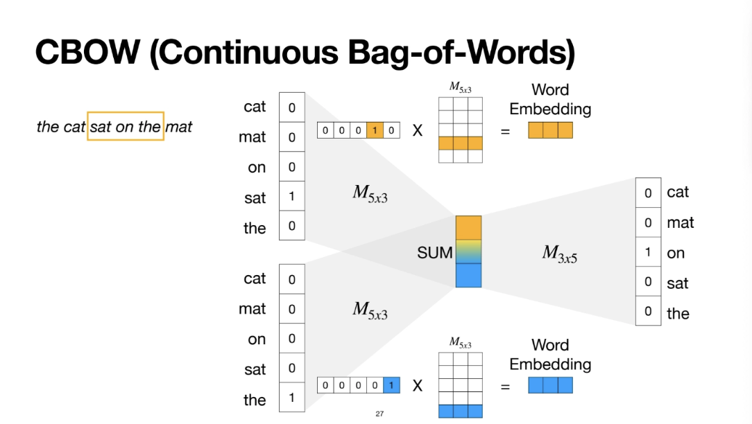 위 ppt에서 the cat sat on the mat 이라는 각각의 단어들의 벡터를 다 더하면