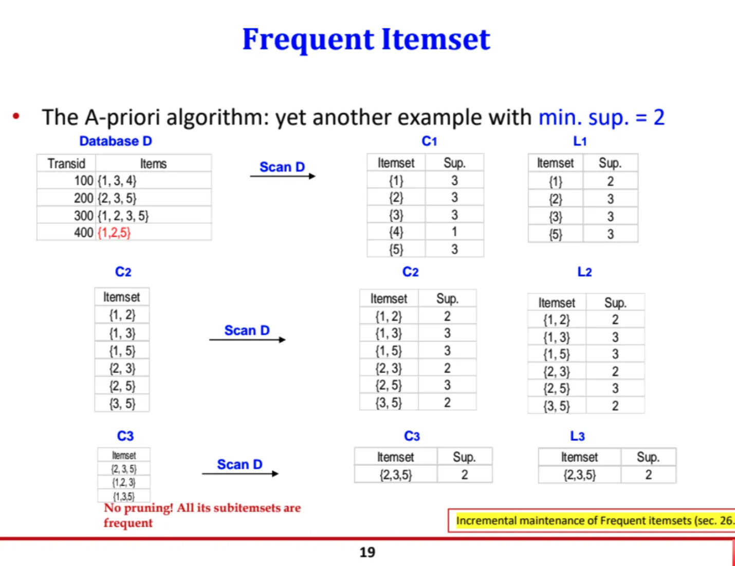 이 단계에서는 frequent하지 않은 부분집합이 나올 수가 없기 때문에