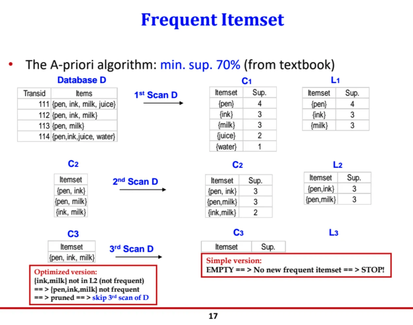 minsup이 70%일 때의 A-priori algorithm을 잘 살펴보자