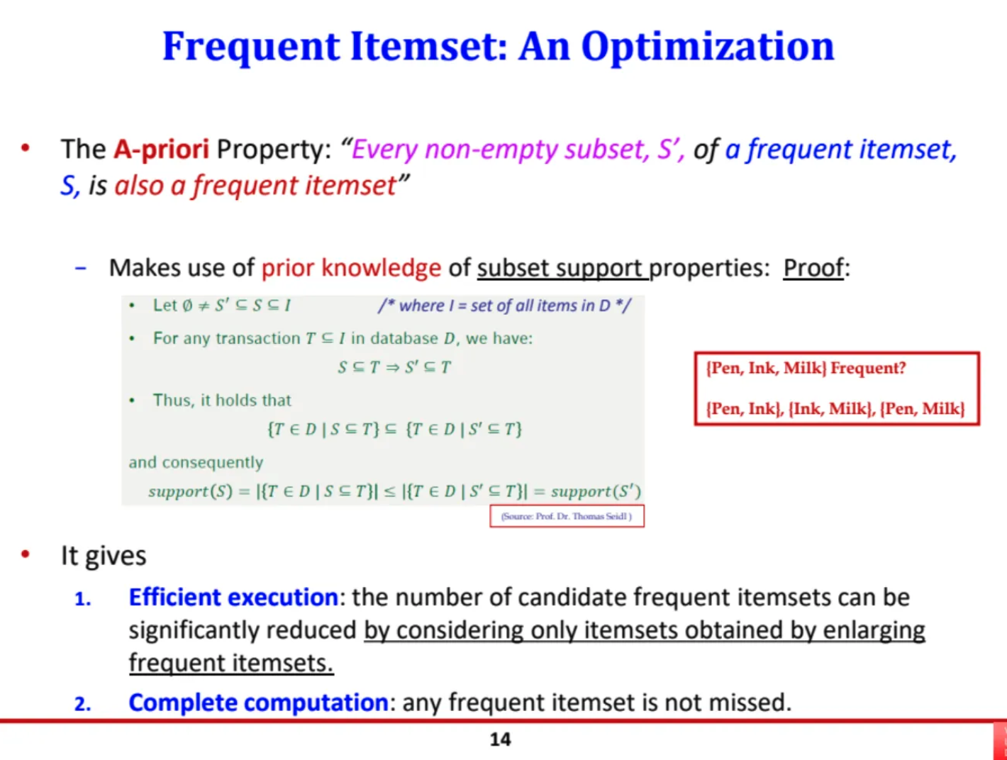 "만약 S가 포함된 subset이 frequent itemset이라면