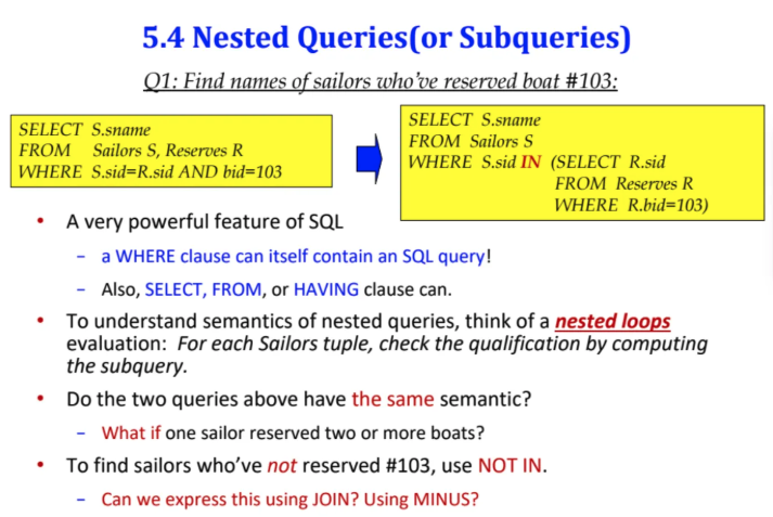 본 게시글은서울대학교 데이터사이언스대학원 이상원 교수님의데이터사이언스 응용을 위한 빅데이터 및 지식기반시스템 강의를학습을 목적으로 재구성하였습니다저번시간에 이어서 계속해서SQL의 표현법에 대해서 알아보자 첫 번째로 나오는 개념은 subquery(혹은 nested query)이다nested query는 쿼리가 안에 있는데그 안에 또 다른 쿼리가 nesting된다는 뜻으로main query와 그 아래에 subquery가 있는 것이다 왼쪽이 그냥 일반 main query만 있는 것이고오른쪽이 subquery로 where의 조건절을 만든 것이다 그렇다면 둘 중에 어떤 것이 더 효과적일까?교수님 말씀에 따르면 오른쪽의subquery를 이용한 쿼리가 더 효율적이라고한다 왼쪽은 그냥 join을 사용한 것이고DBMS..