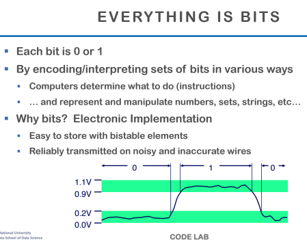 본 게시글은서울대학교 데이터사이언스대학원 성효진 교수님의데이터사이언스를 위한 컴퓨팅 시스템 강의를학습을 목적으로 재구성하였습니다오늘은 시스템 프로그래밍 수업의 두 번째 시간컴퓨터에서 가장 기본이 되는데이터 타입과 0과 1만 인식하는 컴퓨터가이러한 데이터 타입을 어떻게 표현하는지에 대한 내용을 배웠다 어떤 프로그램을 컴퓨터로 표현할 때결국 컴퓨터 내부에서는 그 프로그램을 0과 1로 해석한다 이러한 0과 1의 단위를 Bits(비트)라고 하고컴퓨터는 이러한 비트를 어떠한 방식으로 조합하고어떠한 방식으로 표현을 하는지 약속이 되어있다 이번 수업은 비트 표현법의 약속에 대한 내용이고이는 전자적으로 컴퓨터가 정보를 저장하기 위한 방법이다 아래 그래프를 보면 0일 때는 전압이 0.0V에서 0.2V1일 때는 0...