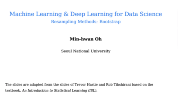본 게시글은서울대학교 데이터사이언스대학원 오민환 교수님의데이터사이언스를 위한 머신러닝 및 딥러닝1 수업을학습을 목적으로 재구성하였습니다이번 시간에는 bootstrap에 관한 내용을 살펴본다 bootstrap은 우리 지난 시간에 배웠던cross validation과 비슷한 맥락이다 이 bootstrap은 하나의 dataset을 이용해서여러 복제본 dataset을 만드는 방법인데아주 유용해서 자주 쓰이는 방법이라고 한다 예를 들어서 데이터셋 하나로 어떤 모델의 파라미터를 구했다고하자이 데이터셋 한개만으로는 파라미터의 uncertainty를 계산하기가 힘들다우리가 앞에서 linear regression과 logistic regression은 가능했지만원래는 쉽지 않다고 한다따라서 bootstrap이 이런..